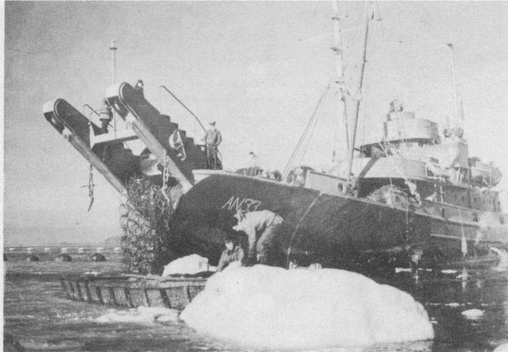 MAKE A MEME View Large Image USS Nutmeg (AN-33).jpg en USS Nutmeg AN-33 maintaining nets probably at Placentia Harbor Argentia Newfoundland date unknown Two men turn to on the ice coating a Mark 2 buoy as the last of a torpedo net is hauled in over the bow US Navy ...