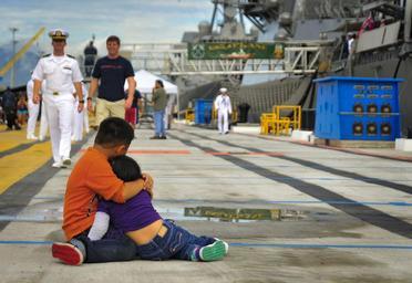 | Keywords: USS O'Kane 140307-N-WF272-002.jpg en Children of a sailor assigned to the guided missile destroyer USS O'Kane DDG 77 comfort each other as the ship departs Joint Base Pearl Harbor-Hickam Hawaii March 7 2014 for a deployment to the Arabian Gulf U S Navy photo by Mass Communication Specialist 3rd Class Diana Quinlan/Released 2014-03-07 Petty Officer 3rd Class Diana Quinlan https //www dvidshub net/image/1185525 140307-N-WF272-002 2014-03-13 08 02 JOINT BASE PEARL HARBOR-HICKAM VA US PD-USGov-Military-Navy 2014 in Pearl Harbor Aboard USS O'Kane DDG-77 USS O'Kane DDG-77 at Pearl Harbor USS O'Kane DDG-77 Images from DoD uploaded by Fæ |