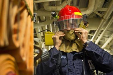Keywords: USS San Antonio action 130812-N-WX580-120.jpg en U S Navy Hull Maintenance Technician 3rd Class Dustin Vonholten dons firefighting equipment during a fire drill aboard the amphibious transport dock ship USS San Antonio LPD 17 Aug 12 2013 in the Gulf of Aden The San Antonio and the embarked 26th Marine Expeditionary Unit were deployed as part of the Kearsarge Amphibious Ready Group in support of maritime security operations and theater security cooperation efforts in the U S 5th Fleet area of responsibility U S Navy photo by Mass Communication Specialist 3rd Class Lacordrick Wilson/Released 2013-08-12 Petty Officer 3rd Class Lacordrick Wilson https //www dvidshub net/image/1019631 130812-N-WX580-120 2013-09-17 02 49 GULF OF ADEN AT SEA PD-USGov-Military-Navy 26th Marine Expeditionary Unit USS San Antonio LPD-17 Images from DoD uploaded by Fæ |