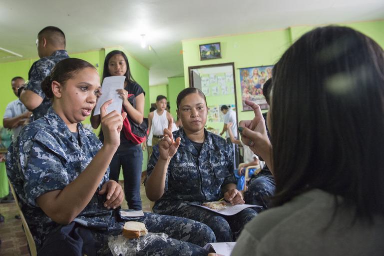 Keywords: USS Shiloh in Olongapo City 150601-N-BB269-277.jpg en 150601-N-BB269-277 SUBIC BAY Philippines June 1 2015 Quartermaster Seaman Alexis Walker left from Toledo Ohio and Seaman Kai M Richardson from Los Angeles Calif both assigned to the Ticonderoga-class guided-missile cruiser USS Shiloh CG 67 learn sign language from a student of the Association of Differently Abled Persons school during a community relation project in Olongapo City The school established in 1991 teaches children and teens whom are deaf mute or blind skill sets needed to communicate with others Shiloh is on patrol in the U S 7th Fleet area of operation in support of security and stability in the Indo-Asia Pacific region U S Navy photo by Mass Communication Specialist 2nd Class Raymond D Diaz III/Released 2015-06-01 Petty Officer 3rd Class Raymond Diaz III https //www dvidshub net/image/1974075 150601-N-BB269-277 2015-06-04 05 50 OLONGAPO CITY PH PD-USGov-Military-Navy USS Shiloh CG-67 Images from DoD uploaded by Fæ |