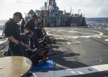 Keywords: USS STOUT (DDG 55) DEPLOYMENT 2016 161107-N-GP524-380.jpg en 161107-N-GP524-380 ATLANTIC OCEAN Nov 7 2016 Sailors assigned to the guided-missile destroyer USS Stout DDG 55 fire M4 rifles during a live-fire exercise Stout deployed as part of the Eisenhower Carrier Strike Group is supporting maritime security operations and theater security cooperation efforts U S Navy photo by Petty Officer 3rd Class Bill Dodge Unit Navy Media Content Services DVIDS Tags SOUDA BAY; SAR; Search and Rescue; formation; ocean; transit; Bahrain; RAS; USNS Pecos; GQ; general quarters; Arleigh Burke-class; America; underway; CIWS; 6th Fleet; Greece; guided-missile destroyer; Manama ; forward deployed; Memorial Day; USS Stout DDG 55 ; ship; SUEZ CANAL; Navy; COMREL; Sailor; community relations; destroyer; replenishment-at-sea; U S Navy; 5th Fleet; deployment; USS Carney ; MC; Stout; USS Stout; DDG 55; Lt Michael Murphy; NMCS; DVIDS Bulk Import; Mass Communication Specialist 3rd Class Bill Dodge; MC3 Bill Dodge; Murph Challenge; ARGONAUT 2016; Sailors giving back 2016-11-07 Petty Officer 3rd Class William Dodge https //www dvidshub net/image/2989460/uss-stout-ddg-55-deployment-2016 161107-N-GP524-380 2016-11-15 01 55 ATLANTIC OCEAN PD-USGov-Military-Navy Manama USS Stout DDG-55 M4 carbine Images from DoD uploaded by Fæ |