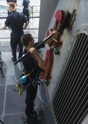 Keywords: USS STOUT (DDG 55) DEPLOYMENT 2016 160728-N-GP524-112.jpg en 160728-N-GP524-112 ARABIAN GULF July 28 2016 Fire Controlman 2nd Class Tyler Moore conducts a freshwater wash down aboard the guided-missile destroyer USS Stout DDG 55 Stout deployed as part of the Eisenhower Carrier Strike Group is supporting maritime security operations and theater security cooperation efforts in the U S 5th Fleet area of operations U S Navy photo by Mass Communication Specialist 3rd Class Bill Dodge/Released Unit Navy Media Content Services DVIDS Tags SAR; Search and Rescue; formation; ocean; transit; Bahrain; RAS; USNS Pecos ; GQ; general quarters; Arleigh Burke-class; America; underway; CIWS; 6th Fleet; guided-missile destroyer; Manama ; forward deployed; Memorial Day; USS Stout DDG 55 ; ship; SUEZ CANAL; Navy; COMREL; Sailor; community relations; destroyer; replenishment-at-sea; U S Navy; 5th Fleet; deployment; MC; Stout; USS Stout; DDG 55; Lt Michael Murphy; NMCS; DVIDS Bulk Import; Mass Communication Specialist 3rd Class Bill Dodge; MC3 Bill Dodge; Murph Challenge; ARGONAUT 2016; Sailors giving back 2016-07-28 Petty Officer 3rd Class William Dodge https //www dvidshub net/image/2768301/uss-stout-ddg-55-deployment-2016 160728-N-GP524-112 2016-08-04 00 53 PERSIAN GULF PD-USGov-Military-Navy Manama USS Stout DDG-55 Images from DoD uploaded by Fæ |