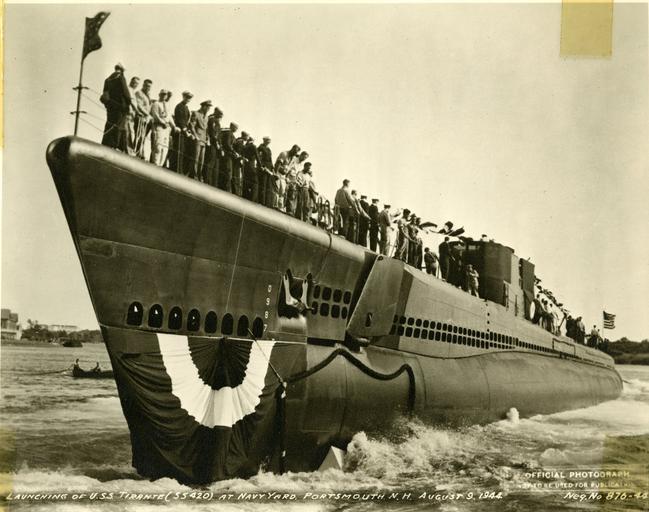 Keywords: USS Tirante (SS 420) on her maiden voyage in 1944.jpg en A tench-class diesel-electric submarine being launched at Navy Yard Portsmouth NH 1944-08-09 United States Navy Naval photographer PD-USGov Uploaded with UploadWizard USS Tirante SS-420 Submarine launching |
