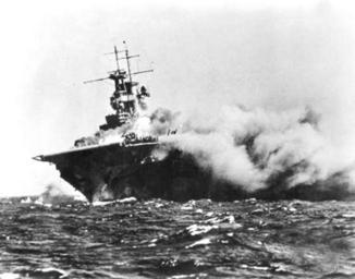 | Keywords: USS Wasp (CV-7) sinking in September 1942.jpg The U S Navy aircraft carrier USS Wasp CV-7 listing and with smoke pouring from oil and gasoline fires caused by three torpedo hits in the starboard side from the Japanese submarine I-19 Her list has been corrected to 4 degrees by transferring oil and her head has been brought round so that the wind blows from the starboard side and drives the smoke off the ship and away from the control areas on the island All damage control efforts however were in vain and she was sunk 400 km north west of Espiritu Santo 302770 1942-09-15 Official U S Navy photo http //www history navy mil/photos/images/g10000/g16331c htm 80-G-16331 from the U S Navy http //www history navy mil Naval History and Heritage Command File USS Wasp CV-7 brennt jpg PD-USGov-Military-Navy USS Wasp CV-7 Burning ships Sinking ships Guadalcanal Campaign 15 September |
