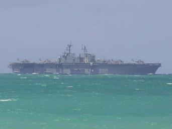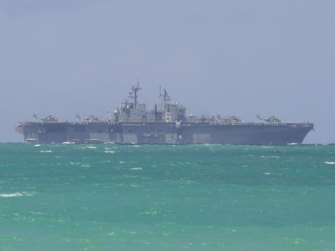 Keywords: USSBonhommeRichardRIMPAC2008.jpg en USS Bonhomme Richard Amphibious Assault Ship LHD-6 off the coast of Oahu shortly before coming about and launching 4 helicopters Own Kagern 2008-07-27 Taken from a beach on Waimanalo Bay Oahu on the day of her arrival for RIMPAC 2008 Canon EOS Digital Rebel 477mm focal length General views of USS Bonhomme Richard LHD-6 RIMPAC 2008 |