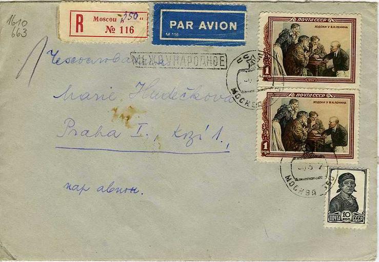| Keywords: USSRcover1957.jpg USSR cover with two USSR Lenin stamps of 1952 and a definitive USSR stamps and registered letter airmail and international mail postmarks and a calendar postmark sent from Moscow to Praha Конве т СССР с двумя ма ками СССР 1952 г Ходоки у Ленина и станда тной ма кой СССР почтовыми я лыками заказное и авиа и вто ичным штемпелем междуна одного письма и календа ным штемпелем отп авленный из осквы в П агу http //molotok ru/item775626561_konvert_sssr_chehoslovakiya_mezhdunarodnoe html Molotok ru Internet auction 2009-10-23 USSR post PD-RU-exempt stamps Stamps of the Soviet Union 1952 Airmail covers Definitive stamps of the Soviet Union Postal covers of the Soviet Union Vladimir Lenin on stamps Leniniana on postal covers Images from molotok ru |