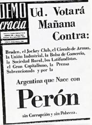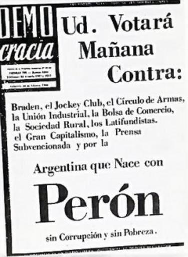 | Keywords: Usted votará mañana contra.jpg es Afiche de la campaña política de 1946 cuando Perón fue electo presidente de Argentina Diario Democracia Buenos Aires Argentina 1946-02-23 Archivo General de la Nación Argentina Author other versions Custom license marker 2015 08 13 PD-AR-Photo PD-1996 1946 Argentine general election Election posters in Argentina Peronismo Advertisements in Argentina Juan Domingo Perón in 1946 Uploaded with UploadWizard | ||||
