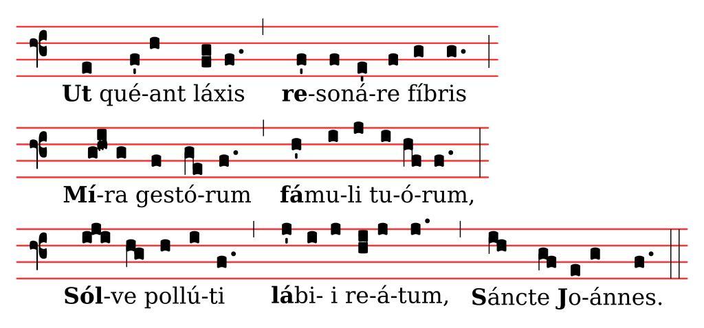 Keywords: UtQueantLaxis-Arezzo.svg en Hymn to John the Baptist used by Guido of Arezzo to name the six notes of the hexacord fr Hymne à Saint Jean Baptiste utilisé par Guido d'Arezzo pour nommer les six notes de l'hexacorde Own Romainbehar 2008-07-19 Image Hymne St Jean Baptiste png File generated from the SVG output of Lilypond with the following file <pre> \version 2 10 33 \include gregorian-init ly \score \new VaticanaVoice \clef vaticana-fa2 c d\ictus f \ d \pes e \ \augmentum d \divisioMinima d\ictus d c\ictus d e \flexa \augmentum e \divisioMaior \score \new VaticanaVoice \clef vaticana-fa2 \ e \quilisma f \pes g \ e d \ e \flexa c \ \augmentum d \divisioMinima f\ictus g a g \ f \flexa d \ \augmentum d \divisioMaxima \score \new VaticanaVoice \clef vaticana-fa2 \ g a g \ \ f \flexa e \ f g \augmentum d \divisioMinima a\ictus g a \ f \pes g \ a \augmentum a \divisioMinima \ g \flexa f \ \ e \flexa d \ c e \augmentum d \finalis </pre> Reworked the sheet music and added lyrics with Inkscape Guido of Arezzo Ut quenat Sheet music examples Ut quenat Music theory Ut quenat Images with LilyPond source code