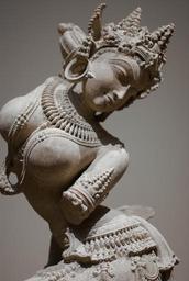 Keywords: Uttar Pradesh Apsara.jpg en Dancing Celestial India Uttar Pradesh Early 12th century Sandstone H 331/2 in 85 1 cm Promised Gift of Florence and Herbert Irving L 1993 88 2 Metropolitan Museum of Art NYC The contours and richly ornamented surfaces of this celestial attendant to the gods exemplify a stylistic shift away from earlier Gupta-influenced forms Here the linear play of surface decoration and dramatic contours replace the earlier emphasis on seamless volume and subtle balance The sculptor has twisted the figure into an extraordinary pose that captures the essence of her dance and seems absolutely believable until one imagines actually trying to turn this way The jewelry sways and emphasizes her movements both in the way the necklaces and sashes follow the curves of her body and in the upward thrust of the spiked tips of her crown The crisp carving of her adornments makes a pleasing contrast with the smooth and rounded surfaces of her flesh Images of dancing semidivine attendants often appear on the outer walls of Hindu temples They are placed near the figures of gods to honor the deity just as actual female dancers honored the gods ™ images within the temple Own Beta s2ph 2008-12-26 08 54 46 Apsara Sculptures from India in the Metropolitan Museum of Art Sculptures from Uttar Pradesh 12th-century statues Statues of Hindu deities Statues of women of India Dance in statues of India
