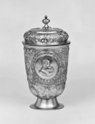 Keywords: V D - Covered Cup - Walters 57815.jpg The sides of this cup contain medallions with a profile portrait of Elizabeth I Empress of Russia from 1741-1762 the double-headed eagle emblem of the Russian Empire and the empress's monogram EP Elizabeth Petrovna placed under a crown The mask-like foliate design in the repoussé indicates a Dutch influence The cup was made by an unknown silversmith who signed with the initials 'VD' active 1741-1753 and assayed by Egor Ivanov active 1752-1758 Cups such as this were presented to members of the empress's guard regiments 1753 Early Modern silver parcel gilt cm 15 5 accession number 57 815 23879 Alexandre Polovtsoff Aleksandr Aleksandrovich Polovtsov Saint Petersburg and Paris by purchase Henry Walters city Baltimore Walters Art Museum Henry Walters Acquired by Henry Walters 1929 Russian Art Icons and Decorative Arts from the Origin to the Twentieth Century The Walters Art Gallery Baltimore 1959-1960 place of origin Moscow Russia Walters Art Museum license Collections of the Walters Art Museum Elizabeth of Russia Profile portraits of Elizabeth of Russia 1753 in art Silver cups in art |