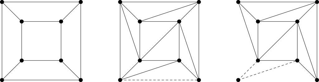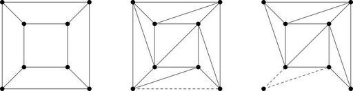 Keywords: V-E+F=2 Proof Illustration.svg M - beginfig 1 pair A B C; A0 1cm 1cm ; A1 5cm 1cm ; A2 5cm 5cm ; A3 1cm 5cm ; A4 2cm 2cm ; A5 4cm 2cm ; A6 4cm 4cm ; A7 2cm 4cm ; for i 0 upto 7 draw Ai withpen pencircle scaled 6pt; Bi Ai + 6cm 0cm ; draw Bi withpen pencircle scaled 6pt; Ci Ai + 12cm 0cm ; draw Ci withpen pencircle scaled 6pt; endfor; draw A0--A1--A2--A3--cycle; draw A4--A5--A6--A7--cycle; draw A0--A4; draw A1--A5; draw A2--A6; draw A3--A7; draw B0--B1 dashed evenly; draw B1--B2--B3--B0; draw B4--B5--B6--B7--cycle; draw B0--B4; draw B1--B5; draw B2--B6; draw B3--B7; draw B4--B6; draw B0--B5; draw B1--B6; draw B2--B7; draw B3--B4; draw C1--C2--C3; draw C4--C5--C6--C7--cycle; draw C0--C4 dashed evenly; draw C1--C5; draw C2--C6; draw C3--C7; draw C4--C6; draw C0--C5 dashed evenly; draw C1--C6; draw C2--C7; draw C3--C4; endfig; end; Polyhedra |