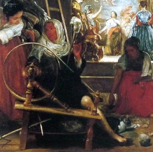 Keywords: V Hilanderas detail 2.JPG Artwork Q984058 Creator Diego Velázquez La obra representa el momento en que la tejedora Aracne fue convertida en araña por la diosa Atenea y es una de las obras mitológicas más conocidas del pintor sevillano Diego Velázquez Ca 1655-1660 oil on canvas Size cm 289 220 Institution Museo del Prado https //www museodelprado es/coleccion/obra-de-arte/las-hilanderas-o-la-fabula-de-aracne/3d8e510d-2acf-4efb-af0c-8ffd665acd8d accession number P01173 own PD-old-100 cc-by-sa-3 0 GFDL Details of Las Hilanderas Spinning wheels in art |