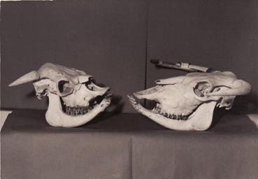 Keywords: Vaca ñata expo Peru.jpg es Craneo de Vaca ñata a la izquierda comparada con el de una vaca normal Exhibición del Museo en el antiguo edificio de Alsina y Perú Probablemente década de 1930 http //elmuseopublicodebuenosaires1812-1862 blogspot it/2013/01/muniz-y-darwin-interesados-en-la-vaca html author 1930 1940 PD-AR-Photo Cattle skulls Mammal skeletons |