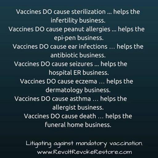 | Keywords: anti vaccine vaccination vax disease health poison population control needle syringe text outdoor Vaccines do cause sterilization, helps the infertility business. Vaccines do cause peanut allergies, helps with the epi-pen business. Vaccines do cause ear infections, helps with the antibiotic business. Vaccines do cause seizures, helps hospital ER business. Vaccines do cause eczema, helps the dermatology business. Vaccines do cause asthma, helps the allergist business. Vaccines do cause death, helps the funeral home business. Anti Vaccination meme collected by A.J. Wilson of iPressThis at FlatEarth.Online, made by others. Vaccines do cause sterilization, helps the infertility business. Vaccines do cause peanut allergies, helps with the epi-pen business. Vaccines do cause ear infections, helps with the antibiotic business. Vaccines do cause seizures, helps hospital ER business. Vaccines do cause eczema, helps the dermatology business. Vaccines do cause asthma, helps the allergist business. Vaccines do cause death, helps the funeral home business. Anti Vaccination meme collected by A.J. Wilson of iPressThis at FlatEarth.Online, made by others. |