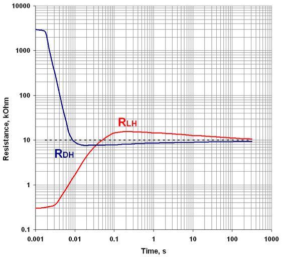Keywords: Vactrol time response chart.png en Response of a LED-LDR optoisolator vactrol to a step change in LED current Note that time scale is logarithmic Blue trace response of a vactrol that was kept dark long enough Owing to memory effect common to all cadmium compounds it overshoots steady-state resistance initially going to a low infinite dark resistance Rdh then slowly recovers to steady-state target black dashed line Most cadmium compounds take hours to settle down completely below measurement error although some take weeks Red trace response of a vactrol that was kept brightly illuminated It overshoots in another direction to a higher-than-expected value Rlh Increase in resistance red trace is typically slower than decrease blue trace Adapted from charts and textual information in PerkinElmer 2001 http //www datasheetcatalog org/datasheet/perkinelmer/VT500 pdf Photoconductive Cells and Analog Optoisolators Vactrols® pp 7-11 29 34 own East of Borschov 2010-11 Vactrol |