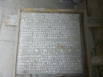 | Keywords: Vakhtang VI commemorative plaque in Astrakhan.jpg ru емо иальная доска посвящённая ца ю Ка тли Вахтангу VI Установлена в Успенском собо е Аст ахани в советское в емя демонти ована в 1990-х годах в ходе еконст укции собо а 2013-12-21 21 37 30 own Andreykor cc-zero Uploaded with UploadWizard Cathedral of the Dormition Astrakhan Vakhtang VI Mkhedruli plaques | ||||