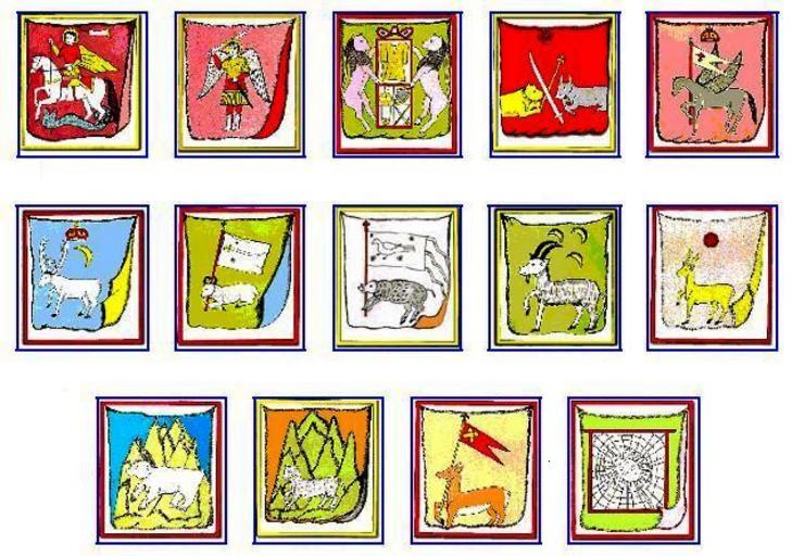 Keywords: Vakhushti Georgian flags collage.PNG en A collage of the Georgian and Caucasian flags found in the atlas authored by the 18th-century Georgian scholar Prince Vakhushti From left to right top to bottom 1 of Georgia 2 of Georgia 3 Royal-Davidic with Tunic 4 of Kartli 5 of Kakheti 6 of Imereti 7 of Samtskhe-Saatabago 8 of Odishi 9 of Abkhazia 10 of Guria 11 of Svaneti 12 of Ossetia 13 of Shirvan 14 of Arran 2012-08-01 own Kober cc-zero Uploaded with UploadWizard Historical flags of Georgia Vakhushti |