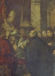 Keywords: Valdes leal-san ignacio recibe la bula.JPG La obra representa a San Ignacio de Loyola el fundador de la Compañía de Jesús recibiendo de manos del papa Paulo III la bula de fundación de la Orden circa 1660 1664 oil on canvas Size cm 160 210 Institution Museo de Bellas Artes Seville http //ceres mcu es/pages/Main accession number CE0184P http //ceres mcu es/pages/Viewer accion 41 Museo AMuseo MBASE Ninv CE0184P txt_id_imagen 1 txt_rotar 0 txt_contraste 0 txt_zoom 10 cabecera N viewName visorZoom PD-old-100 Paintings of Saint Ignatius of Loyola in Spain 17th-century paintings of Saint Ignatius of Loyola Paintings of Saint Ignatius of Loyola by Juan de Valdés Leal Paintings by Juan de Valdés Leal in the Fine Arts Museum of Seville 17th-century paintings in the Fine Arts Museum of Seville 1660s paintings in Spain |