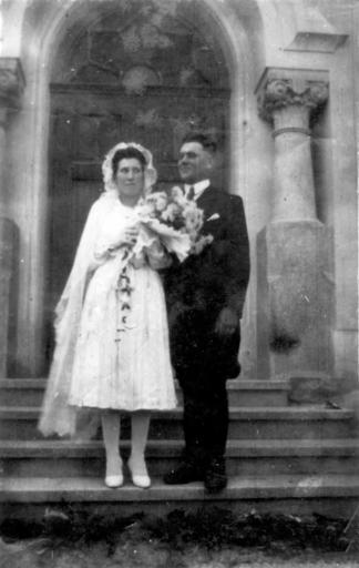 | Keywords: Valeria Cighi and Vasile Ciobanca.jpg en A wedding portrait People from Transylvania ISBN 978-0-9868231-0-7 author interwar period PD-old 47 17 56 N 22 55 10 E cc-by-sa-3 0 Standing couples Veils Black and white portrait photographs at full length Wedding portrait photographs People from Bocșa Sălaj Greek Catolic Church in Bocșa Greek Catholics from Romania People of Transylvania People with flower bouquets People on stairs | ||||