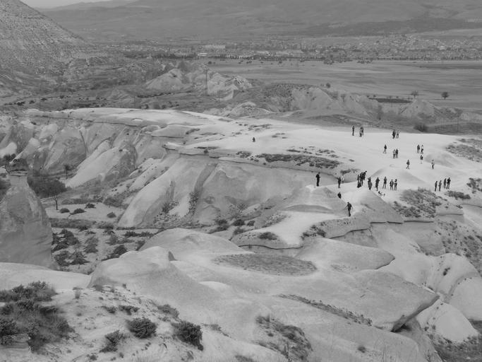 Keywords: valley of love tufa plateau plateau viewpoint human hiking tourists outlook tufa cappadocia turkey black and white