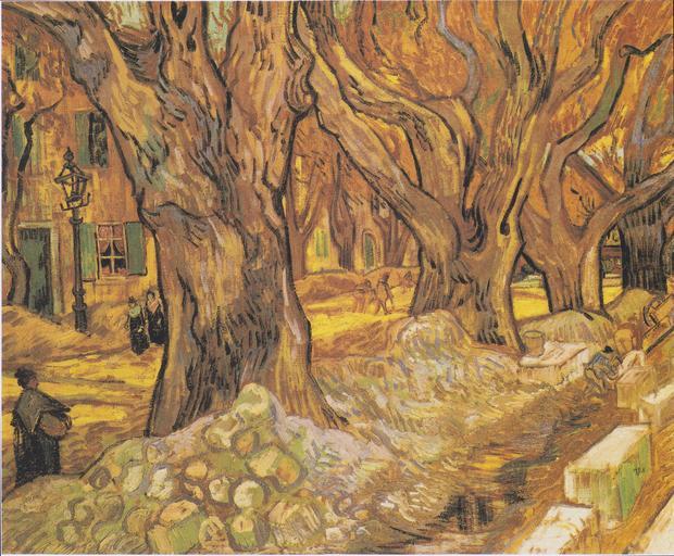 Keywords: Van Gogh - Straßenarbeiter auf dem Boulvard Victor Hugo in Saint-Rémy.jpeg Artwork Creator Vincent van Gogh In 1889 after suffering a severe hallucinatory seizure Van Gogh committed himself to an asylum near Saint-Rémy While walking through the town that fall he was impressed by the sight of men repairing a road beneath immense plane trees Rushing to capture the yellowing leaves he painted this composition on an unusual cloth with a pattern of small red diamonds visible in the picture ™s many unpainted areas In spite of the cold he wrote to his brother I have gone on working outside till now and I think it is doing me good and the work too After painting this composition directly from nature Van Gogh used it to produce a second version in the studio known as The Road Menders at Saint-Rémy Painted on a traditional canvas covered by a ground layer the second version is more restrained the explosive yellows balanced by larger areas of cool color <ref>http //www clevelandart org/art/1947 209 Cleveland Museum of Art</ref> reflist Saint-Rémy 1889 11 oil canvas cm 73 4 91 8 Cleveland Museum of Art Gallery 222b http //www clevelandart org/art/1947 209 The Cleveland Museum of Art<br/>http //www vangoghgallery com/catalog/Painting/471/Road 20Menders 20The html vangoghgallery com object history credit line Gift of the Hanna Fund Van Gogh catalogues 657 1860 accession number 1947 209 repro from artbook PD-old-100 DEFAULTSORT Van Gogh 1889-11 The Large Plane Trees Cleveland Museum of Art Road Menders at Saint-Rémy F657 |