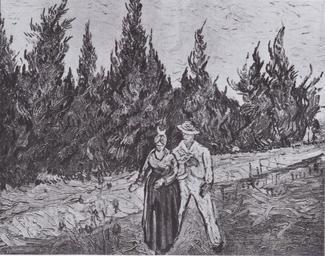 Keywords: Van Gogh - Zypressenweg mit Liebespaar - Der Garten des Dichters IV.jpeg Zypressenweg mit Liebespaar - Der Garten des Dichters IV Cypresses-way with lovers - The garden of the poet IV oil canvas 75 x 92 cm Verbleib unbekannt - 1937 als entartet beschlagnahmt Van Gogh catalogues 481 1615 repro from art book Arles October 1888 Creator Vincent van Gogh PD-old-100 Other versions Landscape paintings by Vincent Van Gogh Arles 1888 Paintings of couples in love Couples in love in the Netherlands |