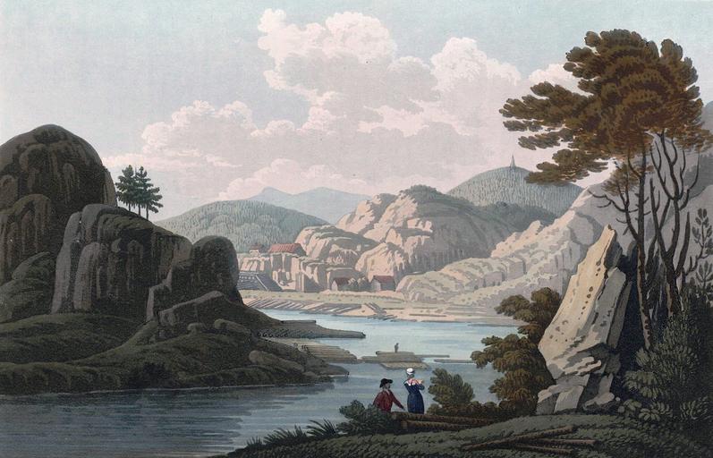 | Keywords: Van soe, near Mos (JW Edy plate 69).jpg Artwork Creator John William Edy en Van soe near Mos No LXIX VAN-SOE NEAR MOS This view presents the scenery to the eastward in the immediate vicinity of Mos where the water from Van-Söe a considerable lake is constructed within a narrow pass between the rocks before it enters that town at the fall situated immediately beyond the dark rock on the left The timber procured on the banks of the Van passes here in vast quantities loose and in rafts gliding down the gentle stream to the Lentz a little way above the bridge; each piece being previously marked by its owner is easily selected and drawn on shore as may be seen under the bare rock from whence it is conveyed over the rail-way to the mills below At times this river is so choked up with it as to present one mass of timber instead of water The barren rock in front appears to be entirely composed of a species of mill-stone of a deep reddish brown colour very hard and heavy cemented together by a sparry matter with glittering spangles and angular grit Its strata ramify in all directions; the surface is destitute of trees and has scarcely any vegetation except a few patches of moss Two habitations and a few huts only are erected on it for shelter during storms A rock on the right composed of a laminated stone with perpendicular fissures is per petually showering down its fragments to the great annoyance of all in its vicinity One or two prams compose the whole fleet of this place Men are continually perambulating the shores with long poles to disentangle and propel the timber ; they frequently ferry themselves over on a single piece; in fact they appear perfectly amphibious and may be seen crawling like cats over or along the sides of the smooth rocks where any other human being would shudder at an attempt to follow them All up this narrow pass for three or four miles the rocks and trees on each side present the most beautiful and romantic scenery imaginable contracting in some places so as almost to meet each other with their tops across the little river beneath in others rising perpendicularly above the clouds with numerous wild-fowls visiting their sides This was also a favourite place for swifts swallows and martins and in the higher regions for eagles and hawks A few eels appeared to be the only fishes in the river On entering the lake a vast expanse of water presents itself with low long islands covered with trees and a distant flat country clothed in the same manner beyond it If it were on a smaller scale it would be called sylvan or Italian scenery from its perfect serenity and unity of parts When we turn round and look back upon the mountainous and hilly vicinity of the east side of Mos it appears to be another creation both in form and colour It is a pleasant walk from Mos to the top of a conical hill a mile distant on the apex of which is a mark from whence the panoramic view is of amazing extent including almost the whole country within a circle of forty miles diameter a great portion of the Fiord and all its islands from near Drobak to the Fader over Teion with Holmstrand Tonsberg Jarlsberg c ; in the west Paradise-hill near Dram ; in the north vast forests ; in the east Van-Söe; in the south the entire bay with the town of Mos its cascade ships iron-works saw-mills and isthmus of sand near the bottom of the hill Collapse bottom http //urn nb no/URN NBN no-nb_digibok_2011072910001 Boydell's picturesque scenery of Norway London 1820 Plate no 69 p 349 in scanned copy no-nb_digibok_2011072910001 PD-Art-100 John William Edy Boydell's picturesque scenery of Norway Vansjø |