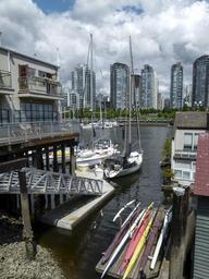 Keywords: vancouver false creek harbor port city metropole city centre boats buildings skyscrapers skyline water house boats sailing boats ship