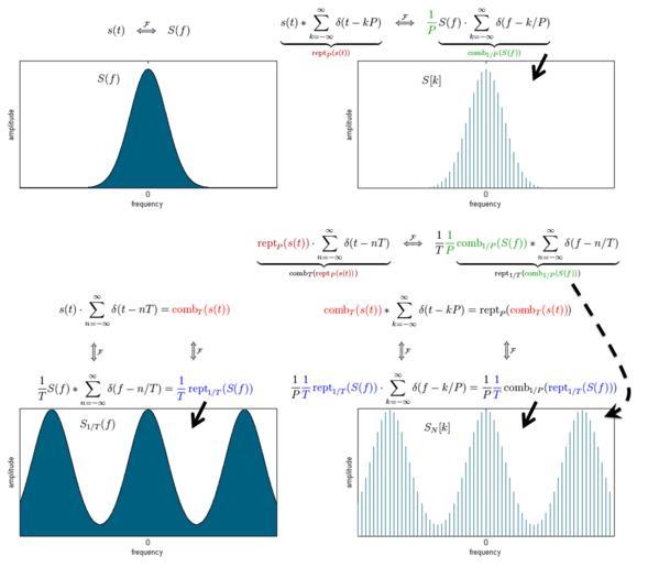 Keywords: Variations of the Fourier transform.tif math Dirac comb functions and the convolution theorem to model the effects of sampling and/or periodic summation At lower left is a DTFT the spectral result of sampling s t at intervals of T The spectral sequences at a upper right and b lower right are respectively computed from a one cycle of the periodic summation of s t and b one cycle of the periodic summation of the s nT sequence The respective formulas are a the Fourier series <u>integral</u> and b the DFT <u>summation</u> The relative computational ease of the DFT sequence and the insight it gives into S f make it a popular analysis tool 2011-12-13 own Bob K https //commons wikimedia org/wiki/File Fourier_transform _Fourier_series _DTFT _DFT gif Matlab commands <source lang Matlab > N 1024; x -N/2 N/2-1; 1xN y exp -0 1 x 2 ; 1xN z exp -0 8 x 2 ; 1xN Y fftshift abs fft y zeros 1 7 N ; W exp j 2 pi/ 3 N x' -4 N 4 N-1 ; Nx1 1x8N Z abs z W ; 1xN Nx8N figure subplot 2 2 1 area -4 N 4 N-1 Y 'FaceColor' 0 4 6 xlim -4 N 4 N-1 ; set gca 'XTick' 0 set gca 'YTick' ylabel 'amplitude' xlabel 'frequency' subplot 2 2 3 area -4 N 4 N-1 Z 'FaceColor' 0 4 6 xlim -4 N 4 N-1 ; set gca 'XTick' 0 set gca 'YTick' ylabel 'amplitude' xlabel 'frequency' Y1 zeros 1 8 N ; Y1 1 128 end Y 1 128 end ; subplot 2 2 2 stem -4 N 4 N-1 Y1 '-' 'Color' 0 4 6 ; set findobj 'Type' 'line' 'Marker' 'none' xlim -4 N 4 N-1 ; set gca 'XTick' 0 set gca 'YTick' ylabel 'amplitude' xlabel 'frequency' Z1 zeros 1 8 N ; Z1 1 128 end Z 1 128 end ; subplot 2 2 4 stem -4 N 4 N-1 Z1 '-' 'Color' 0 4 6 ; set findobj 'Type' 'line' 'Marker' 'none' xlim -4 N 4 N-1 ; set gca 'XTick' 0 set gca 'YTick' ylabel 'amplitude' xlabel 'frequency' </source> LaTex <math>s t \quad\stackrel \mathcal F \Longleftrightarrow \quad S f \ </math> <math>Sk \quad S_ 1/T f \quad S_Nk\ </math> <math>\underbrace s t \sum_ k -\infty \infty \delta t-kP _ \color BrickRed \operatorname rept _P s t \quad\stackrel \mathcal F \Longleftrightarrow \quad \color OliveGreen \frac 1 P \underbrace S f \cdot \sum_ k -\infty \infty \delta f-k/P _ \color OliveGreen \operatorname comb _ 1/P S f \ </math> <math>\underbrace s t \cdot \sum_ n -\infty \infty \delta t-nT _ \operatorname comb _T s t \quad\stackrel \mathcal F \Longleftrightarrow \quad \frac 1 T \underbrace S f \sum_ n -\infty \infty \delta f-n/T _ \operatorname rept _ 1/T S f \ </math> <math>s t \cdot \sum_ n -\infty \infty \delta t-nT \color Red \operatorname comb _T s t \ </math> <math>\frac 1 T S f \sum_ n -\infty \infty \delta f-n/T \color Blue \frac 1 T \operatorname rept _ 1/T S f \ </math> <math>\underbrace \color BrickRed \operatorname rept _P s t \cdot \sum_ n -\infty \infty \delta t-nT _ \operatorname comb _T \color BrickRed \operatorname rept _P s t \quad\stackrel \mathcal F \Longleftrightarrow \quad \frac 1 T \color OliveGreen \frac 1 P \underbrace \color OliveGreen \operatorname comb _ 1/P S f \sum_ n -\infty \infty \delta f-n/T _ \operatorname rept _ 1/T \color OliveGreen \operatorname comb _ 1/P S f </math> <math>\underbrace \operatorname comb _T s t \sum_ k -\infty \infty \delta t-kP _ \operatorname rept _P \operatorname comb _T s t \quad\stackrel \mathcal F \Longleftrightarrow \quad \frac 1 P \frac 1 T \underbrace \operatorname rept _ 1/T S f \cdot \sum_ k -\infty \infty \delta f-k/P _ \operatorname comb _ 1/P \operatorname rept _ 1/T S f </math> <math> \color Red \operatorname comb _T s t \sum_ k -\infty \infty \delta t-kP \operatorname rept _P \color Red \operatorname comb _T s t </math> <math>\frac 1 P \color Blue \frac 1 T \operatorname rept _ 1/T S f \cdot \sum_ k -\infty \infty \delta f-k/P \frac 1 P \color Blue \frac 1 T \operatorname comb _ 1/P \color Blue \operatorname rept _ 1/T S f </math> cc-zero Uploaded with UploadWizard Fourier analysis Digital signal processing Amplitude |