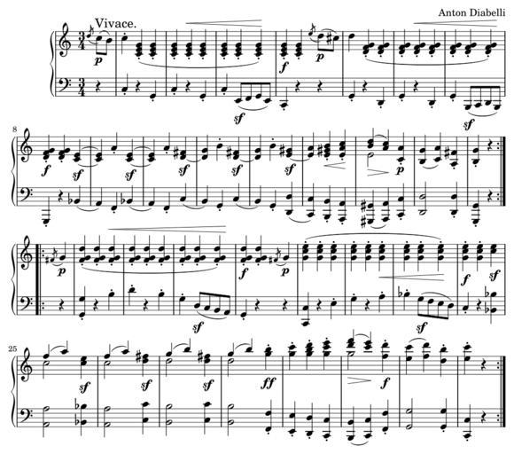 Keywords: Variations on a Waltz by Diabelli - Theme.svg en 50 Variations on a Waltz by Diabelli theme fr 50 variations sur une valse de Diabelli thème 2012-01-25 own Romainbehar File Beethoven - Diabelli Variations - 00 ogg en File Diabelli Var00 full jpg cc-zero Uploaded with UploadWizard GNU LilyPond images Images with LilyPond source code Anton Diabelli Diabelli Variations Piano solos Sheet music for piano 50 Variations on a Waltz by Diabelli Op 120 Beethoven File generated from the SVG output of Lilypond using the following file then edited with Inkscape <pre> \header title 50 Variations on a Waltz by Diabelli Op 120 Beethoven subtitle Theme by Anton Diabelli source IMSLP53028 Werke Breitkopf Serie 17 No 165 composer Anton Diabelli copyright Public Domain \version 2 14 2 \score \new PianoStaff << \new Staff \clef treble \time 3/4 \partial 4 \acciaccatura d8 c\p b' \mark Vivace c4- <c' e' g'>- <c' e' g'>- \dynamicUp <c' e' g'>- <c' e' g'>- \< <c' e' g'>- <c' e' g'>- <c' e' g'>- <c' e' g'>- \ \dynamicNeutral <c' e' g'>- \f <c' e' g'>- \acciaccatura e8 \ d8 \p cis \ d4 <d' f' g'>- <d' f' g'>- \dynamicUp <d' f' g'>- <d' f' g'>- \< <d' f' g'>- <d' f' g'>- <d' f' g'>- <d' f' g'>- \ \dynamicNeutral \break <d' f' g'>- \f <d' f' g'>- <c' e'>~\sf <c' e'> a'- <c' e'>~\sf <c' e'> a'- <d' fis'>~\sf <d' g'> b'- <d' fis'>~\sf <d' g'> b'- <e' gis'>~\sf \dynamicNeutral <e' a'> <e' gis' b'>- \< <e' a' c>- \ << <b' d> \> <a' c> \ \\ e'2 >> <c' a'>4- \p <b g'>4 <c' a'> <a fis'>- <b g'>- r4 \bar \acciaccatura fis'8 g'4\p \dynamicUp <f' g' d>- <f' g' d>- <f' g' d>- \< <f' g' d>- <f' g' d>- <f' g' d>- <f' g' d>- <f' g' d>- <f' g' d>- \ \dynamicNeutral <f' g' d>- \f <f' g' d>- \acciaccatura fis'8 g'4\p <g' c e>- <g' c e>- <g' c e>- <g' c e>- <g' c e>- <g' c e>- \< <g' c e>- <g' c e>- <g' c e>- \ <g' c e>- \f <g' c e>- <c e>\sf \break << f a \\ c2 >> <c e>4\sf << f4 a \\ c2 >> <d fis>4\sf << g4 b \\ d2 >> <d fis>4\sf << g4 b \\ d2 >> <g b>4- \ff <g c>4- <g b d>- <g c e>- << <d f> \> <c e> \ \\ g2 >> <f d>4- \f <e c>4 <f d> <d b>- <e c>- r \bar \new Staff \clef bass \time 3/4 \partial 4 \grace s8 r4 c4- r g - c4- r g - c4- \ e 8 \sf f g e \ c 4- r r g - r d - g - r d - g - \ b 8 \sf c d b \ \break g 4- r bes a f - bes a f - c b g - c b g - <d d> <c c> <b b >- <a a >- <gis gis > <a a > <c c>- <d d>2 <d d>4- <g g >- r4 \bar \grace s8 r4 <g g>- r b- d'- r b- g- \ d8 \sf c b a \ g 4- r r <c c> r e- g- r a- bes- \ g8 \sf f e d \ c4- r <bes bes> \break <a a>2 <bes bes>4 <a a>2 <c c'>4 <b b>2 <c c'>4 <b b>2 <f f>4- <e e>- <d d>- <c c>- <b b > <c c> <f f>- <g g>2 <g g>4- <c c>- r \bar >> </pre> |