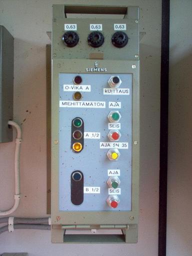 Keywords: Varmistuslukko- ja opastinturvalaitos.jpg Signal control panel located at the siding/loop switch of Arola railway station in Finland The control panel is a part of the Switch lock and signal safety apparatus used on low-traffic-density railway lines in Finland Route is set from Kontiomäki on to track 2 and home signal A½ is cleared to show Clear 35 Slow Clear Varmistuslukko- ja opastinturvalaitoksen ohjaustaulu vaihdemiehen kopissa Arolan asemalla Kulkutie on turvattu Kontiomäeltä raiteelle 2 ja opastin A½ on asetettu näyttämään opastetta Aja sn 35 2005-05-26 own assumed TeVe Rail transport traffic control |