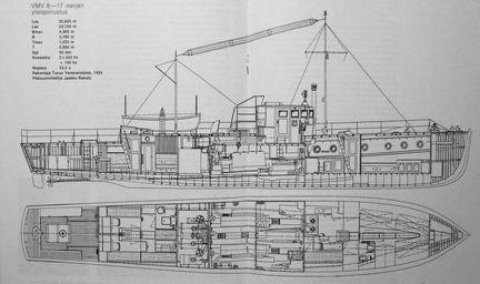 | Keywords: Vartiomoottorivene sarja 8-17.JPG fi Vartiomoottorivene 8-17 -sarjan yleispiirustus pääsuunnittelija Jaakko Rahola rakentaja Turun Veneveistämö 1935 fi Patrol vessel series 8-17 1935 VM 11 VM Entistämistoimikunta 1992<br> own photo Jaakko Rahola design Abc10 photo other versions PD-Old cc-by-sa-4 0 Ships built in Finland Naval ships of Finland Patrol vessels of Finland Uploaded with UploadWizard | ||||