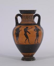 Keywords: Vatican G 23 Group - Black-figure Pseudo-Panathenaic Amphora with Discus Thrower - Walters 482109 - Side B.jpg Panathenaic amphorae were prizes given to victors at the Panathenaic all-Athens festival the great state festival of Athens It was held every four years much like the Olympic games The prize amphorae were quite large and contained olive oil the most valuable part of the award Smaller versions such as this one were produced as commemorative objects Each Panathenaic vase depicts a striding armed Athena on the front As the city's patron goddess in whose honor the festival was given she was thought to preside over the games The back shows the particular event for which the prize was given Here the contest is discus-throwing and a competitor appears with his trainer holding a staff and another athlete ca 500 485 BC Classical terracotta cm 38 1 23 5 accession number 48 2109 32454 William Randolph Hearst San Simeon date and mode of acquisition unknown William Randolph Hearst Estate Sale May 1958 no 5494 Walters Art Museum 1958 by purchase Museum purchase 1958 Goddess and Polis The Panathenaic Festival in Ancient Athens Hood Museum of Art Hanover; Tampa Museum of Art Tampa; Virginia Museum of Fine Arts Richmond; Princeton University Art Museum Princeton 1992-1993 Heroes Mortals and Myths in Ancient Greece The Walters Art Museum Baltimore; Frist Center for the Visual Arts Nashville; San Diego Museum Of Art San Diego; Alexander S Onassis Public Benefit Foundation USA New York 2009-2011 place of origin Athens Greece Walters Art Museum license Ancient Greek black-figure pottery in the Walters Art Museum Group of Vatican G 23 Pseudo-Panathenaic amphoras Athletes in ancient Greek pottery Ancient discus throw Media contributed by the Walters Art Museum needs artist update |
