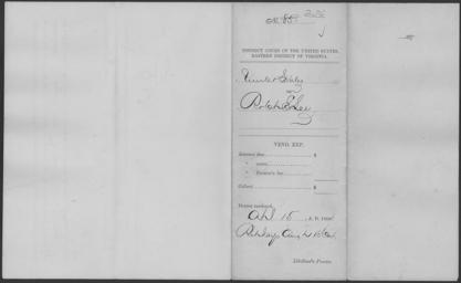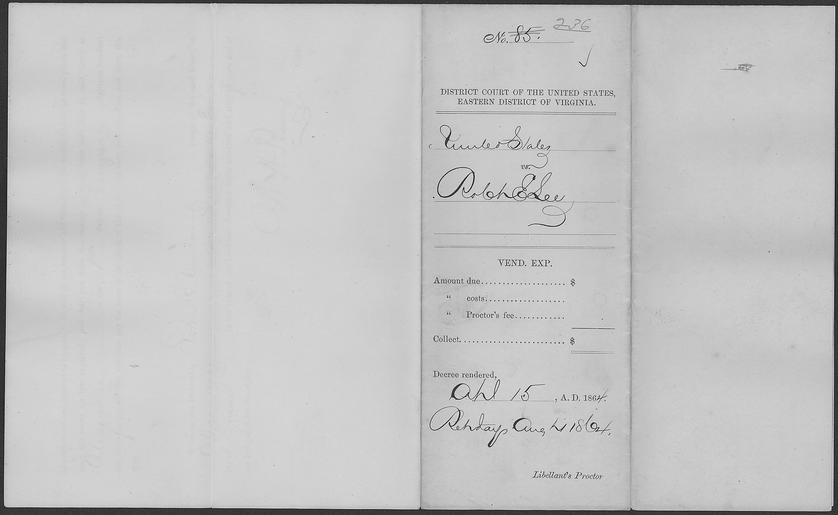 | Keywords: Venditioni Exponas filed in U.S. v. All the Rights, Titles, of Robert E. Lee (Robert E. Lee Confiscation Case) - NARA - 279095.tif Scope and content This venditioni exponas Latin for expose to sale commands the U S Marshal to give ten days notice of the sale of personal property and twenty days notice of the sale of real estate in the case of U S v All the Rights Titles of Robert E Lee It further orders the Marshal to sell the personal property only and have the money from the sale in the Court at Alexandria on August 1 1864 General notes This document was filed by William H Barry Clerk The Robert E Lee Confiscation Case was originally docketed as Case 85 Prior to transfer to the National Archives the cases were rearranged alphabetically and the Robert E Lee Case renumbered as Case 236 Researchers may see annotations for both numbers on various documents but the original case is retrieved using Case 236 279095 Local identifier U S District Court for the Eastern District of Virginia Alexandria Term 06/11/1864 - ca 1866 NARA's Mid Atlantic Region Philadelphia NRBA 900 Market Street Philadelphia PA 19107-4292 date 1864 06 24 - 1864 06 24 Record group Record Group 21 Records of District Courts of the United States 1685 - 2004 Record group ARC 350 Confiscation Case Files compiled 1863 - 1865 Series ARC 279086 File unit U S v The Right Title Interest and Estate of Robert E Lee 08/29/1863 - 06/24/1864 File unit ARC 279087 Variant control numbers NAIL Control Number NRBPA-21-51E147-236-8 yes Other versions <gallery> File Venditioni_Exponas_filed_in_U S _v _All_the_Rights _Titles _of_Robert_E _Lee_ Robert_E _Lee_Confiscation_Case _-_NARA_-_279095 tif tif File Venditioni_Exponas_filed_in_U S _v _All_the_Rights _Titles _of_Robert_E _Lee_ Robert_E _Lee_Confiscation_Case _-_NARA_-_279095 jpg jpg </gallery> NARA-cooperation PD-USGov Manuscripts Legal documents Robert Edward Lee 1864 documents 24 June NARA TIF images with categorized JPGs |