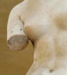 Keywords: Venus de Milo Louvre Ma399 n8.jpg So-called Venus de Milo Aphrodite from Melos detail of the upper block join surface of the right upper arm with mortise; attachment holes which probably bore a metal armlet; strut hole above the navel now covered with plaster Parian marble ca 130-100 BC Found in Melos in 1820 Vénus de Milo détail du bloc supérieur section du bras droit avec mortaise ; trous de fixation probablement pour un bracelet métallique ; au niveau de la taille cavité rebouchée d'un étai Marbre de Paros vers 130-100 av J -C Provenance Mélos moderne Milo 1820 H 2 02 m 6 ft 7 ½ in Museum Louvre Temporary location Department of Paintings Sully first floor room 74 Hamiaux M Les Sculptures grecques II Paris 1998 no 52 pp 41-44 object history credit line Gift of the Marquis de Rivière to Louis XVIII of France 1821 accession number Ma 399 LL 299 Jastrow 2007 other versions Venus de Milo |
