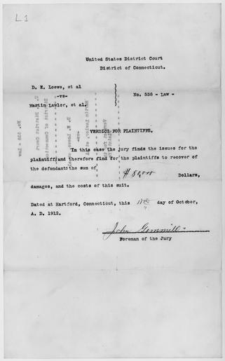 | Keywords: Verdict for the plaintiffs in the case of Loewe v. Lawlor - NARA - 278249.tif Scope and content This document is part of the file on the case of Loewe v Lawlor In 1901 - 1902 the United Hatters of North America attempted to unionize the employees of Dietrich Loewe and Partners a hat making company in Danbury CT When the company resisted the attempt to unionize its employees and the union called a strike and a nation-wide boycott of the company's products Loewe then sued the 191 members of the local for violating the Sherman Antitrust Act The US District Court agreed with the plaintiff and fined the union 74 000 The Circuit Court of Appeals 2nd Circuit overruled this decision but then the US Supreme Court revised the Court of Appeals decision and sent the case back for retrial in 1908 The union again lost in 1912 and was fined 250 000 Because the union was not incorporated the individual union members were liable for the fine In 1917 the US District Court ordered the sale of the homes of 140 members of the local union in order to pay for the fine General notes 278249 Local identifier U S Circuit Court for the District of Connecticut 09/24/1789 - 01/01/1912 NARA's Northeast Region Boston NRAAB 380 Trapelo Road Waltham MA 02452-6399 date 1912 10 11 - 1912 10 11 Record group Record Group 21 Records of District Courts of the United States 1685 - 2004 Record group ARC 350 Case Files compiled 1790 - 1911 Series ARC 593465 File unit Loewe v Lawlor 08/1903 - 01/05/1915 File unit ARC 278237 Variant control numbers NAIL Control Number NRAB-21-CASECCCT-538LAW-L yes Other versions NARA-cooperation PD-USGov United States district court cases February 1910 Unions sindicatos and social movements Strikes in the 1900s 1910 documents Danbury Connecticut 1910 in the United States |