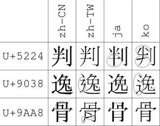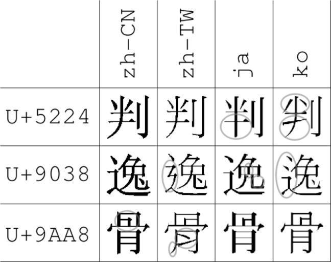 Keywords: Vergleich zh-Hant-CN zh-Hant-TW ja-Hani ko-Hani.png thumb There is a vector version of this image available Image Vergleich zh-Hant-CN zh-Hant-TW ja-Hani ko-Hani svg But it shouldn't be used instead of this bitmap version in the cases where the reflection of the norms should be shown as the characters provided by the Unicode standard are given in a bitmap format Vergleich der Zeichen 判 é ¸ 骨 Langzeichen für Chinesisch Volksrepublik Chinesisch Taiwan Japanisch Koreanisch Die Schriftzeichen sind abgebildet wie in ISO/IEC 10646 2003 Information technology ” Universal Multiple-Octet Coded Character Set UCS Seite 22 und Tabellen http //isotc iso org/livelink/livelink/fetch/2000/2489/Ittf_Home/PubliclyAvailableStandards htm Sie entsprechend den in den Standards GB2312-80 CNS 11643-1992 1st plane JIS X 0208-1990 KS C 5601-1987 unique ideographs und KPS 9566-97 spezifizierten Darstellungen Weitere Quelle Ken Lunde CJKV information processing Chinese Japanese Korean Vietnamese computing O'Reilly 1999 S 128 ISBN 1565922247 Die Grafik wurde als SVG mit Inkscape erstellt und die Grafiken aus der ISO Norm eingefügt Die Markierungen sollen die Unterschiede in den einzelnen Darstellungen aufzeigen User Lyhana8 sagt dass die chinesische Form für Taiwan für é ¸ falsch ist Hier wird es aber gemäß dem Unicode Standard gezeigt Comparison of the characters 判 é ¸ 骨 traditional variants for Chinese Mainland Chinese Taiwan Japanese Korean The Characters are pictured as reported in ISO/IEC 10646 2003 Information technology ” Universal Multiple-Octet Coded Character Set UCS page 22 und tables http //isotc iso org/livelink/livelink/fetch/2000/2489/Ittf_Home/PubliclyAvailableStandards htm They comply with the representations in standards GB2312-80 CNS 11643-1992 1st plane JIS X 0208-1990 KS C 5601-1987 unique ideographs and KPS 9566-97 Additional source Ken Lunde CJKV information processing Chinese Japanese Korean Vietnamese computing O'Reilly 1999 S 128 ISBN 1565922247 This image was created in Inkscape with inserting the bitmap forms of the characters from the ISO norm The marked positions show the differences in appearance User Lyhana8 states that the Chinese Taiwan form for é ¸ is wrong it is shown here in the form given by the Unicode Standard though own 07 11 2006 User chrislb Zur freien Benutzung Siehe Image Langcjk png für einen weiteren Vergleich Unicode Location not applicable ISO standards IEC standards Comparisons of different sets of Chinese characters |