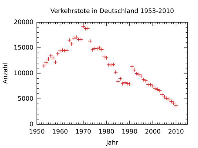 | Keywords: Verkehrstote deutschland 1953-2010.svg en Traffic deaths in Germany 1953-2010 de Verkehrstote in Deutschland 1953-2010 Verkehrstote_deutschland_1953-2008 svg 2011-05-23 09 50 UTC Verkehrstote_deutschland_1953-2008 svg Benny R derivative work Horas <span class signature-talk >talk</span> de Verkehrstote in Deutschland 1953-2008 own Benny R 2009-11-17 gnuplot 4 5 <pre> reset set terminal svg size 400 300 enhanced font Verdana 10 set title Verkehrstote in Deutschland 1953-2010 set xtics 10 set mxtics 10 set xlabel Jahr set yrange 0 20000 set xrange 1950 2015 set ytics 5000 set mytics 5 set ylabel Anzahl unset key set output verkehrstote_deutschland_1953-2010 svg plot unfaelle dat u 1 6 with points set output set terminal pop reset </pre> <pre> unfaelle dat Quelle Statistisches Bundesamt http //www destatis de/jetspeed/portal/cms/Sites/destatis/Internet/DE/Content/Statistiken/Zeitreihen/LangeReihen/Verkehr/Content100/lrvkr002a templateId renderPrint psml Abrufdatum 23 5 2011 Jahr Polizeilich erfasste Unfälle insgesamt davon mit Personenschaden Sachschaden Verunglückte insgesamt davon Getötete Verletzte 2010 2398414 288287 2110127 374791 3651 371140 2009 2313453 310806 2002647 401823 4152 397671 2008 2293663 320614 1973049 413524 4477 409047 2007 2335005 335845 1999160 436368 4949 431419 2006 2235318 327984 1907334 427428 5091 422337 2005 2253992 336619 1917373 438804 5361 433443 2004 2261689 339310 1922379 445968 5842 440126 2003 2259567 354534 1905033 468783 6613 462170 2002 2289474 362054 1927420 483255 6842 476413 2001 2373556 375345 1998211 501752 6977 494775 2000 2350227 382949 1967278 511577 7503 504074 1999 2413473 395689 2017784 528899 7772 521127 1998 2257649 377257 1880392 505111 7792 497319 1997 2232379 380835 1851544 509643 8549 501094 1996 2269570 373082 1896488 501916 8758 493158 1995 2238301 388003 1850298 521595 9454 512141 1994 2270818 392754 1878064 526229 9814 516415 1993 2345396 385384 1960012 515540 9949 505591 1992 2384579 395462 1989117 527428 10631 516797 1991 2311466 385147 1926319 516835 11300 505535 1990 2010575 340043 1670532 456064 7906 448158 1989 1997787 343604 1654183 457392 7995 449397 1988 2022648 342299 1680349 456436 8213 448223 1987 1977501 325519 1651982 432589 7967 424622 1986 1935595 341921 1593674 452165 8948 443217 1985 1840295 327745 1512550 430495 8400 422095 1984 1780818 359485 1421333 476232 10199 466033 1983 1692934 374107 1318827 500942 11732 489210 1982 1629089 358693 1270396 478796 11608 467188 1981 1678497 362617 1315880 487618 11674 475944 1980 1684604 379235 1305369 513504 13041 500463 1979 1660680 367500 1293180 499663 13222 486441 1978 1619187 380352 1238835 523306 14662 508644 1977 1523392 379046 1144346 523120 14978 508142 1976 1418523 359694 1058829 495401 14820 480581 1975 1264567 337732 926835 472667 14870 457797 1974 1228997 331000 897997 461756 14614 447142 1973 1324738 353725 971013 504548 16302 488246 1972 1381526 378775 1002751 547338 18811 528527 1971 1338059 369177 968882 536812 18753 518059 1970 1392007 377610 1014397 550988 19193 531795 1969 1213587 338921 874666 489033 16646 472387 1968 1181156 339704 841452 485354 16636 468718 1967 1144210 335552 808658 479132 17084 462048 1966 1167823 332622 835201 473700 16868 456832 1965 1099346 316361 782985 449243 15753 433490 1964 1089086 328668 760418 462666 16494 446172 1963 1096539 314642 781897 438811 14513 424298 1962 1079101 321257 757844 442933 14445 428488 1961 1029381 339547 689834 462470 14543 447927 1960 990127 349315 640812 469366 14406 454960 1959 843412 327595 515817 433649 13822 419827 1958 751784 296697 455087 384693 12169 372524 1957 678889 299866 379023 389145 13004 376141 1956 663741 307012 356729 396572 13427 383145 1955 603351 296071 307280 383951 12791 371160 1954 523765 267925 255840 347032 12071 334961 1953 473027 251618 221409 326606 11449 315157 </pre> Statistics of Germany Images with Gnuplot source code Damage by road transport Road transport statistics |