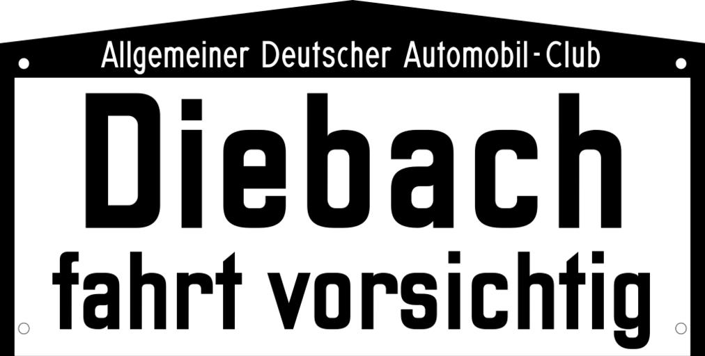 Keywords: Verkehrszeichen - Ortstafel Diebach - fahrt vorsichtig, ADAC.svg de Deutsches Verkehrszeichen Ortstafel Diebach - fahrt vorsichtig Ein vom ADAC bei einer Berliner Emaillierfabrik in Auftrag gegebenes Ortsschild Solche Ortstafeln stellten der ADAC in Eigenregie von 1912 bis 1934 auf Diese Tafel ist ein sehr frühes Beispiel Nachdem die Länderverordnungen spätestens nach dem Ende des ersten Weltkriegs keine Fortsetzung mehr fanden wurde die Aufstellung von Ortstafeln erst mit Einführung der Reichs-Straßenverkehrs-Ordnung ab dem 1 Oktober 1934 wieder eine Aufgabe des Staates https //web archive org/web/20160708153607/http //nummernschildmuseum de/adac/ Selbst gezeichnet und interpretiert durch Mediatus Mediatus 2016-07-08 other fields + Signs User Mediatus/no-new-version Cc-zero PD-VzKat German language signs SVG road signs in Germany Black and white signs Diagrams of information road signs of Germany ADAC road signs Diebach |