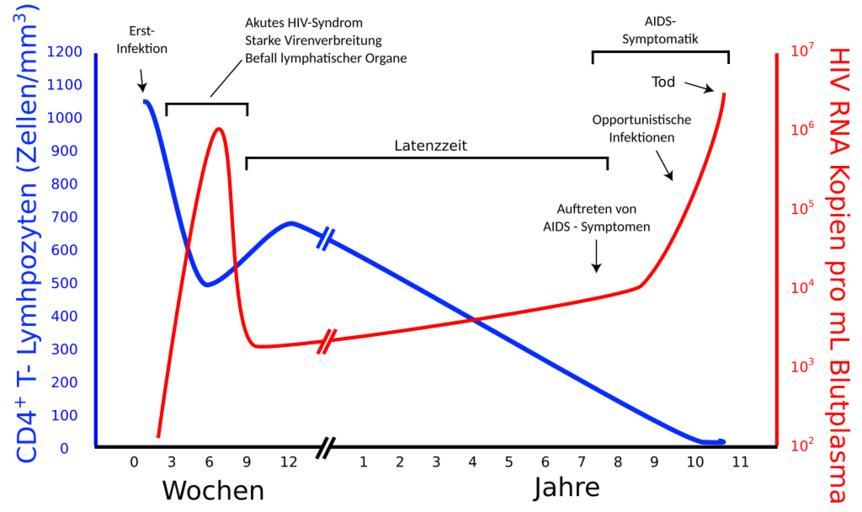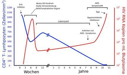 Keywords: Verlauf einer HIV-Infektion.svg de Deutsche à bersetzung der vektorisierten Darstellung eines Graphen mit Auftragung der HI-Virenlast pro mL Blutplasma gegen die Anzahl der CD4-positiven T-Zellen pro mm³ Blut 2012-06-16 http //commons wikimedia org/wiki/File Hiv-timecourse_copy svg Sigve cc-zero Uploaded with UploadWizard HIV time course |