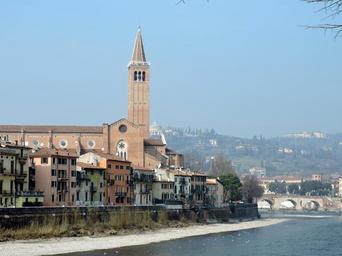 Keywords: verona river adige landscape church campanile water italy houses colorful