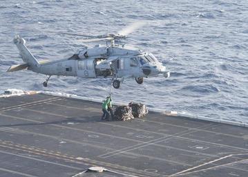 MAKE A MEME View Large Image Vertical replenishment in the Atlantic 130130-N-HG389-274.jpg en An MH-60S Sea Hawk assigned to the Dusty Dogs of Helicopter Sea Combat Squadron 7 delivers cargo from aircraft carrier USS Harry S Truman to frigate USS Kaufman during a ...