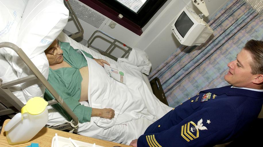 | Keywords: VETERAN VISITS DVIDS1072704.jpg en NEW YORK New York Nov 8 2002 --Senior Chief Chris Weiller of Coast Guard Activites New York visits with 77-year old U S Army World War II Veteran Murray Gilman at the 23rd Street Veterans Medical Center Military members from the Coast Guard and Navy visited hospitalized veterans along with 30 students from Queens District 28 delivering Veterans Day cards in support of Operation Thank a Veteran The Coast Guard and School District 28 have delivered more than 15 000 cards to New York City Veterans for the last three years USCG photo by PA1 Tom Sperduto Unit U S Coast Guard District 1 DVIDS Tags VETERAN; ELDERLY; PATIENT; MURRAY; RELATIONS; WWII; COMMUNITY; GILMAN; CHRIS; CGVI; WEILLER; DVIDS Bulk Import 2002-11-08 Petty Officer 1st Class Thomas Sperduto https //www dvidshub net/image/1072704/veteran-visits 1072704 2013-12-11 15 49 NEW YORK NY US PD-USGov Veterans Day 2002 Images from DoD uploaded by Fæ |