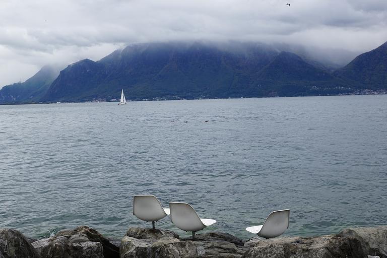 Keywords: vevey switzerland lake geneva lake water mountains fog landscape bank chairs sailing boat