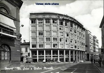Keywords: Al centro l'edificio ad angolo realizzato nel 1959 e progettato dall'arch. Luigi Mattioni. Degli edifici dell'antica via Verbano sopravvive solo la bassa costruzione senza portici, incuneata tra alti edifici multipiano, che verrà sostituita da un controverso progetto solo negli anni '80. All'estrema destra uno spicchio di casa Sacco/Ghirlanda (arch. Francesco Peverelli, 1808) sostituita nel 1964 dal palazzo della Banca d'Italia (arch. Ignazio Gardella). A sinistra l'edificio del 1855 dell'albergo Europa (già albergo Italia). varese viawaltermarcobi |