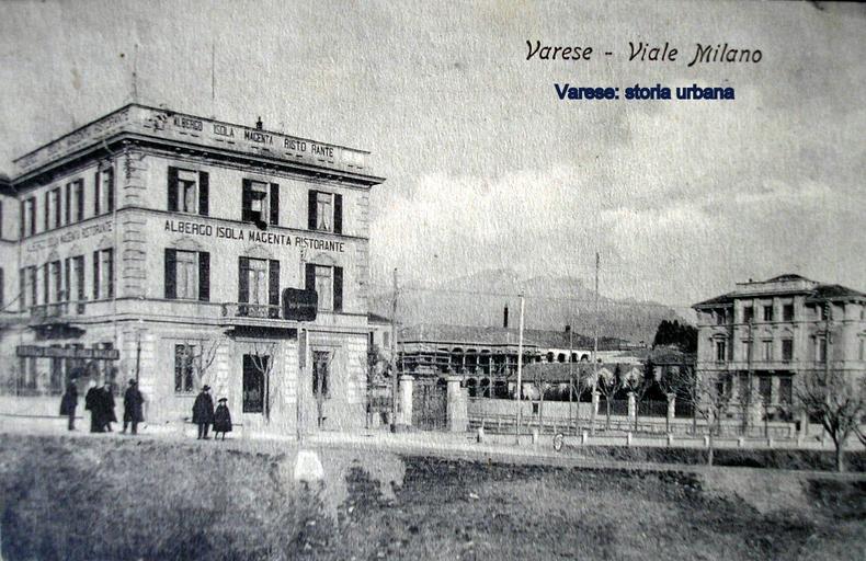 Keywords: L'albergo Isola Magenta, a sinistra l'imbocco di via Morosini. In secondo piano il cantiere per la costruzione dell'edificio della scuola elementare "G. Mazzini" in via Como. Ben visibile la scarpata erbosa affacciata sui binari delle Ferrovi Nord Milano. varese |