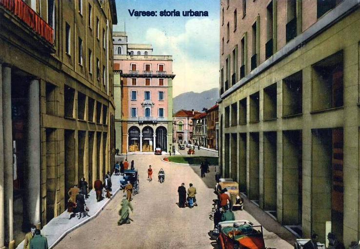 Keywords: Versione colorata. Vista di una animata via Volta, a destra Via Verbano (ora Marcobi) con la cortina dei vecchi edifici appena intaccata dal palazzo Ras, al centro piazza Monte Grappa con palazzo Verga (ing. Mario Cantù) acquarellato in un curioso (e inesistente nella realtà) colore rosa. varese piazzamontegrappa viaverbano viawaltermarcobi |