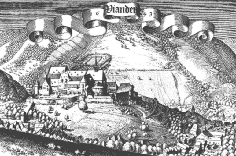 Keywords: Vianden Luxembourg Merian 1643.png en Vue upon the castle of Vianden Engraving by Mathias Merian in his work Typographia Alsatiae own Mathias Merian 1643 uploaded by Christian Ries Vianden castle Mathias Merian