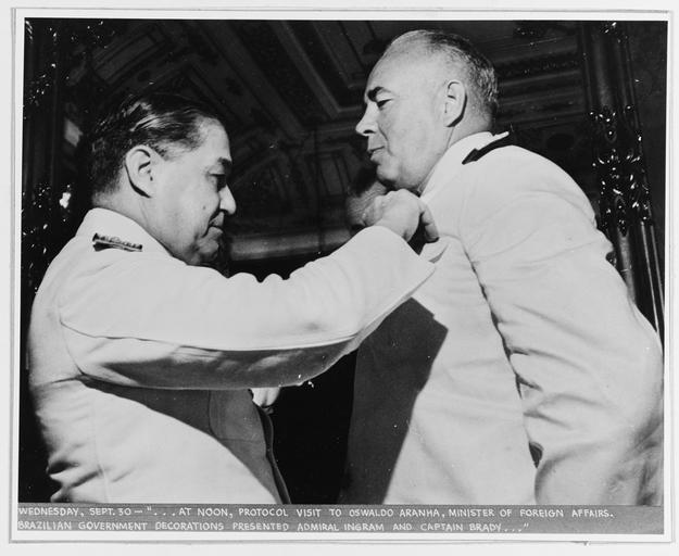 Keywords: Vice Admiral Jonas H. Ingram.tif en A 30 September 1942 photograph taken as the Brazilian Minister of Marine Vice Admiral Guilhem was confering a decoration upon Vice Admiral Jonas H Ingram USN Secretary Knox was visiting Brazil during this time Portion of head in background is likely that of Oswaldo Aranha the Minister of Foreign Afffairs s 30 eptember 1942 http //www history navy mil/our-collections/photography/us-people/i/ingram-jonas-h-views-taken-1940-1943/nh-48323 html Secretary of the Navy Frank Knox other versions Custom license marker 2016 01 19 PD-USGov-Military-Navy Jonas Howard Ingram Black and white portrait photographs of men of the United States |