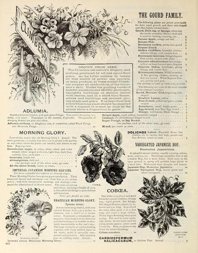 Keywords: Vick's garden and floral guide (16537221106).jpg see Novelty Pages <br> These Morning Glories have given great satisfaction Their <br> exquisite beauty and enormous size from four to six inches <br> across 1 with their innumerable markings and shadings com- <br> mand the admiration of all flower lovers The vines are strong COB <br> and robust attaining a height of 30 to <br> 50 feet while the foliage is quite distinct <br> and luxuriant <br> Price per packet JO cents <br> BRAZILIAN MORNING GLORY <br> Ipomcea setosa <br> A most interestingclimbcr with rose <br> colored flowers from 3 to 4 inches in <br> diameter and a leaf 8 to 12 inches <br> across It presents a remarkable ap- <br> pearance branching in every direction <br> and intertwining so as to make it abso- <br> lutely impenetrable to the sun's rays <br> The large seed pods or curious looking <br> capsules with short reddish hairs on <br> the stems make it unusually orna- <br> mental andattractivc After planting <br> morning glory pour on scalding water Annual <br> Ipomcea setosa 'Brazilian Morning Glory 10 <br> 40 <br> DOLICHOS Lablab Hyacinth Bean\ fine <br> climber six to twenty feet high purple and <br> lilacflowers ounce 20 cents 5 <br> VARIEGATED JAPANESE HOP <br> Humulus Japonicus <br> A splendid annual climber rapidly covering arbors <br> walls trellises etc The foliage resembles that of the <br> common Hop but is more dense Seed sown in the <br> open ground in spring will produce large plants in <br> a short time Withstands heat drought and insects <br> Japanese Hop Humulus Japonicus 10 <br> Japanese Variegated Hop leaves green and <br> white variegated xo <br> COBCEA <br> One of the very finest and most <br> beautiful annual climbers of large <br> size rapid growth fine foliage <br> bell-shaped flowers almost 1 in - <br> across and 2 in long Ingoodsoil <br> the stems often grow 20 or 30 feet <br> long and cover a large surface <br> Plants begin flowering when quite <br> young Put seed in moist earth <br> edge dtnvn; do not water until the <br> young plants appear unless earth <br> is very dry Remove plants to the <br> house for winter blooming <br> Coboea scandens 10 <br> CARDIOSPERMUM <br> HALICACABUM or Balloon Vine <br> Annual 43864393 149533 78224 Page 40 Text http //www biodiversitylibrary org/page/43864393 1900 10 5962/bhl title 78224 Henry G Gilbert Nursery and Seed Trade Catalog Collection ; James Vick's Sons Rochester N Y Biodiversity Heritage Library Vick's garden and floral guide 1900 Garden Stories Catalogs Commerce Flowers Gardening James Vick's Sons Rochester N Y Rochester N Y Seeds Vegetables U S Department of Agriculture National Agricultural Library bhl page 43864393 dc identifier http //biodiversitylibrary org/page/43864393 James Vicks Sons bhlGardenStories Climbers BHLinbloom james vick's sons rochester n y rochester n y u s department of agriculture national agricultural library james vicks sons bhlgardenstories bhlinbloom Information field Flickr posted date ISOdate 2015-02-17 CC-BY-2 0 BioDivLibrary https //flickr com/photos/61021753 N02/16537221106 2015-08-24 22 54 45 cc-by-2 0 PD-old-70-1923 Vick's garden and floral guide Photos uploaded from Flickr by Fæ using a script |